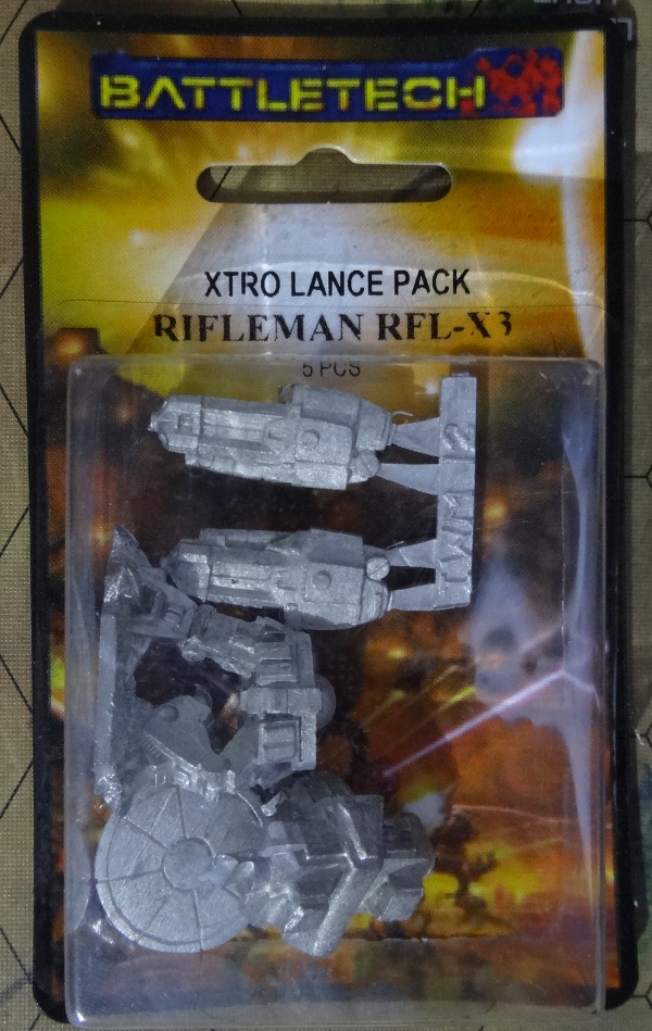 Wie angekündigt, hier die zweite Miniatur aus dem XTRO Lance Pack, der Rifleman RFL-X3 „Muse Wind“, ausstehen tun damit nur noch der Victor VTR-9K2 sowie der Wraith TR2-X. Der ‚Mech stammt aus dem XTRO: Davion und ist vollgepackt mit Clantech, zwei HAG 20s und 2 Medium Pulse Laser.