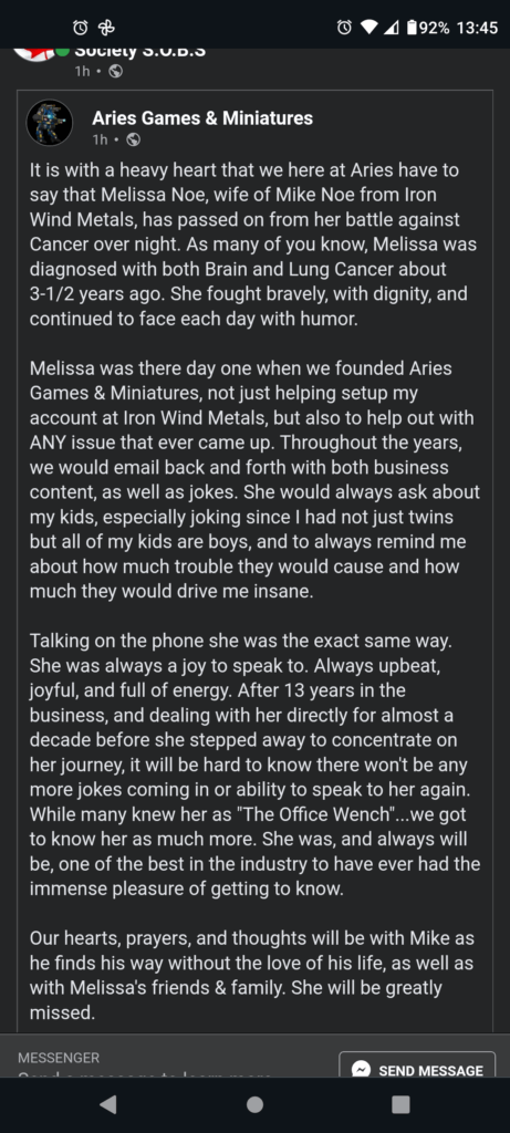 Leider muss ich mitteilen, dass Melissa Noe mittlerweile ihren Tumoren erlegen ist, wie Aries Games a & Miniatures mitteilt.